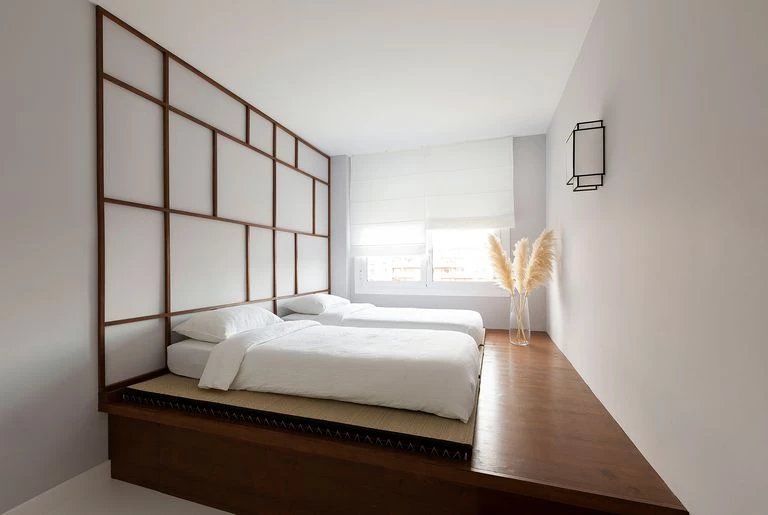 En otro de los dormitorios de la casa, se colocó una tarima con dos camas como las que se utilizan para poner los tradicionales tatamis. Inspirándose en los biombos japoneses, también se diseñó un panel decorativo a modo de cabecero y se instaló iluminación led de colores para recrear el ambiente de las noches en Tokio.