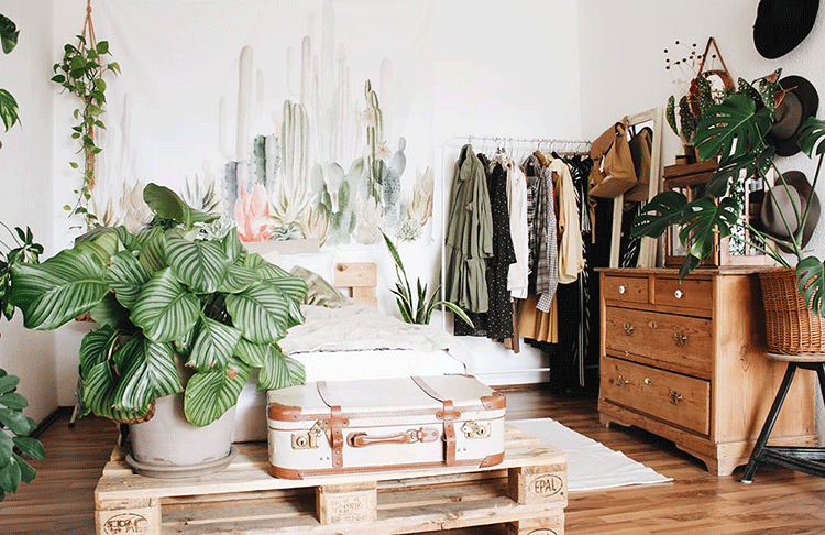 Un dormitorio cálido y acogedor, con estilo raw y repleto de plantas, es el protagonista de este recorrido deco.