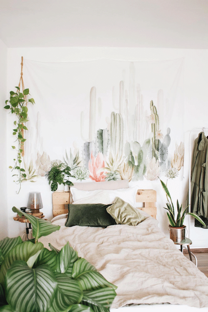 La cama se hizo con palets, una alternativa súper canchera, relajada, económica y fácil de hacer en un fin de semana. Sobre ella, se colocó un tapiz decorativo repleto de cactus y suculentas de diferentes colores suaves. ¡Una delicadeza!