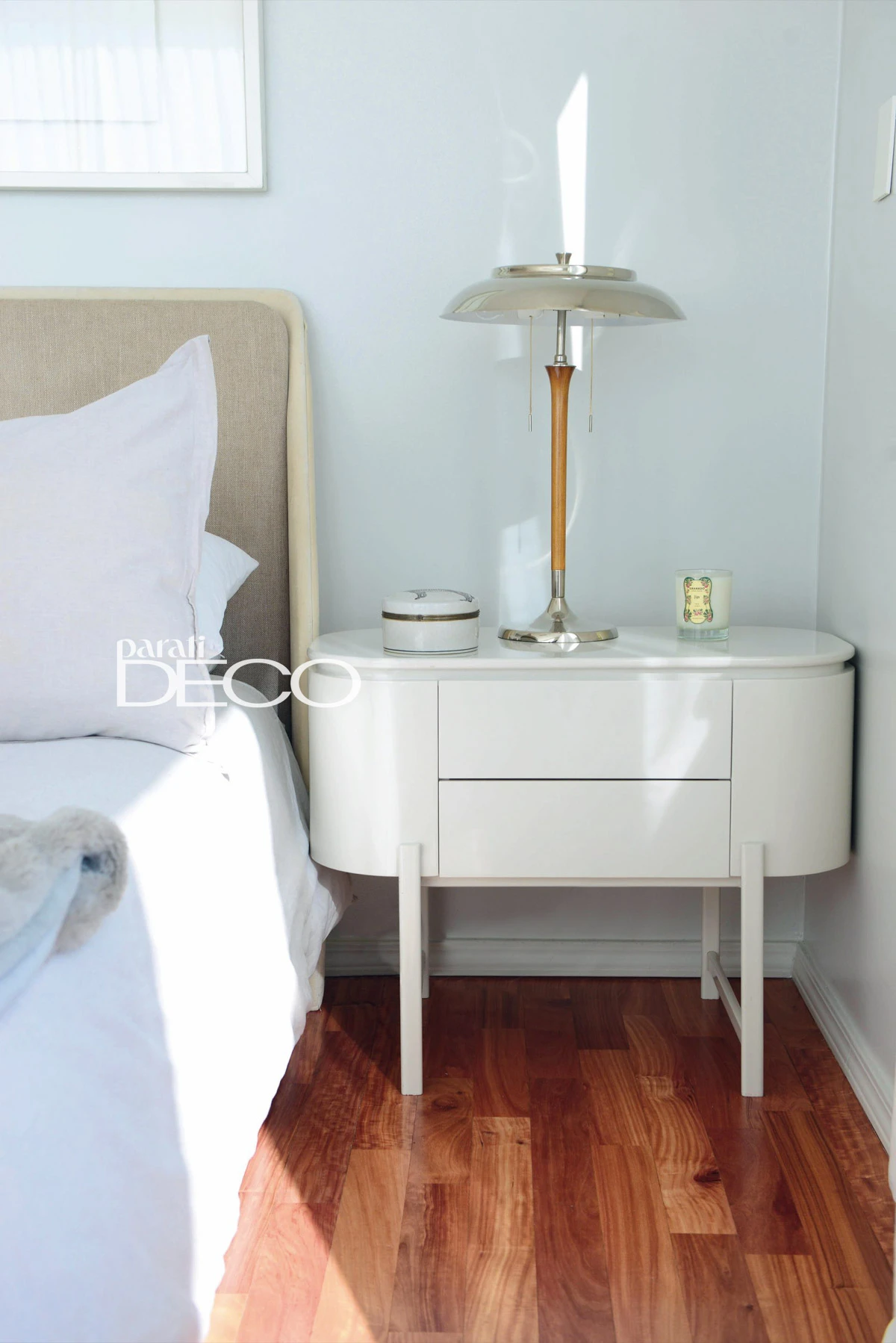 En el ambiente se impone una paleta de colores naturales y claros, y se destacan el escritorio y mesas de luz laqueadas el color visón claro. Ambos son diseños desarrollados por Bchb (@bchbarquitectura), igual que la cama tapizada en linos y panas naturales.