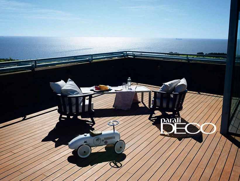 La terraza cuenta con un espacio cerrado vidriado, en el que se utilizó una lona color visón micro perforada para atenuar el ingreso de luz. En el quincho, alrededor de la mesa de madera maciza (Primitiva) quemada a alta temperatura para lograr su color negro, se dispusieron sillas en color madera natural (Landmark). Este sector se separa de la parrilla y barra mediante un módulo vertical.