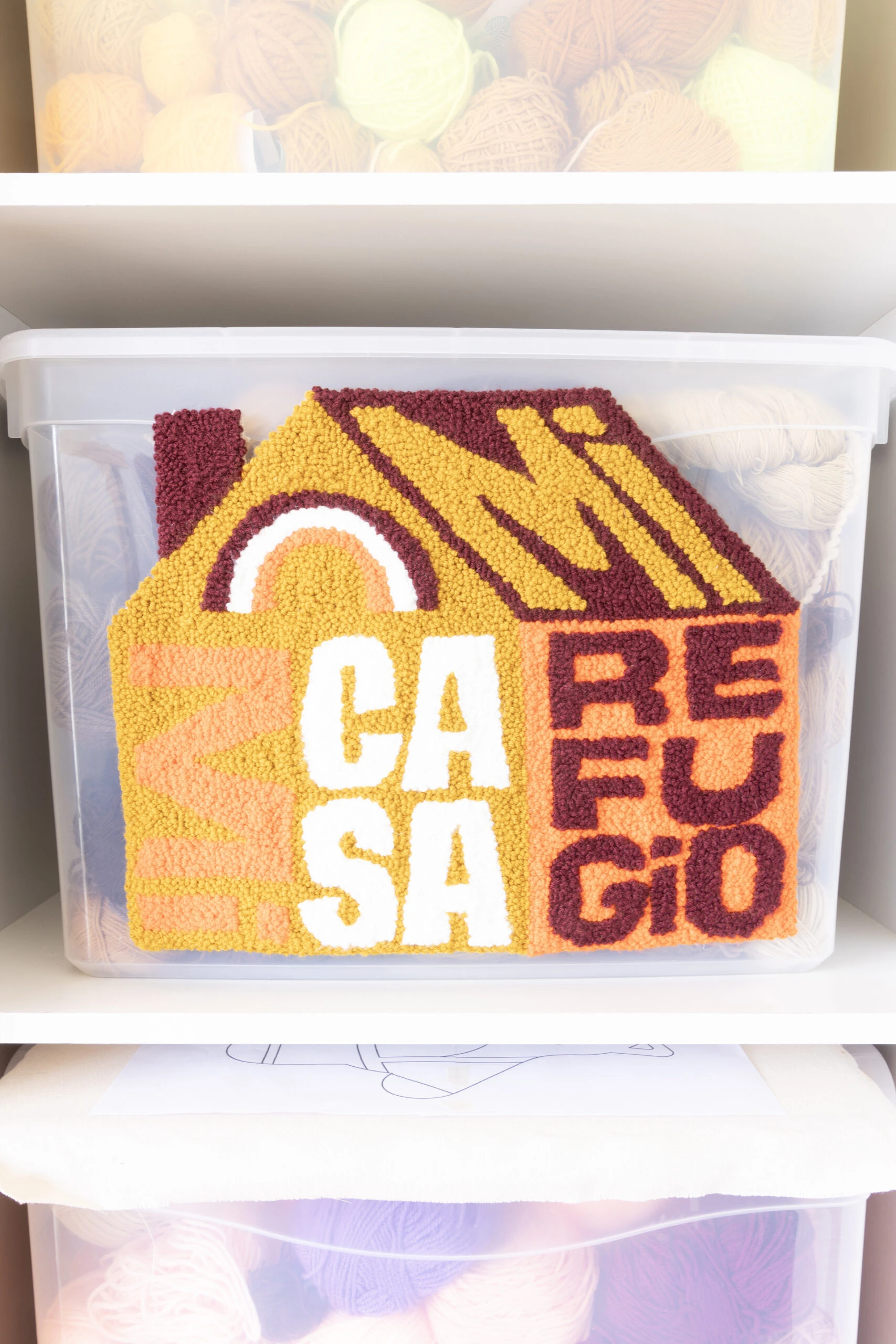 Es un cuarto/taller iluminado, colmado de herramientas de trabajo, coloridos ovillos de lana guardados y a la vista en contenedores transparentes, bastidores, piezas terminadas y exhibidas en plan decorativo y algunos de sus libros y colaboraciones en una pequeña biblioteca.