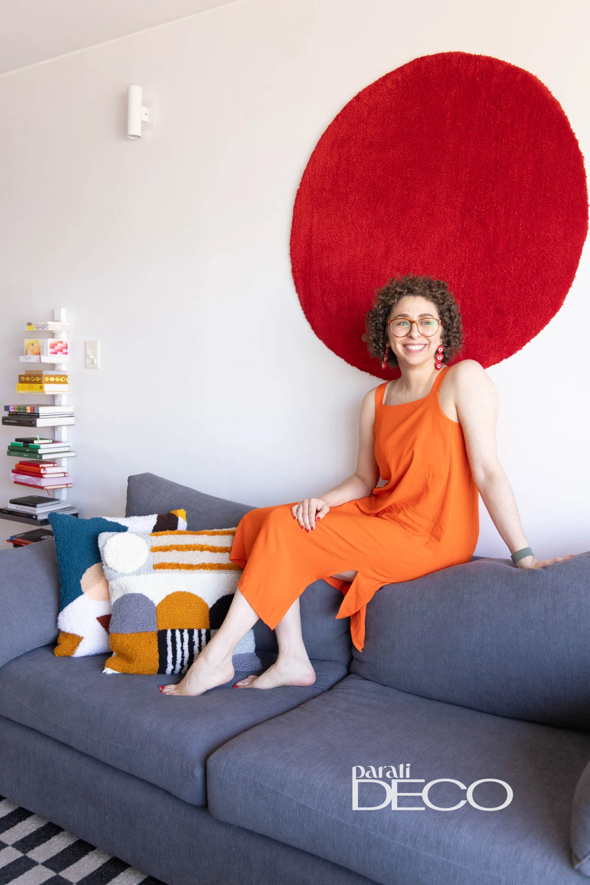El círculo rojo que simboliza el sol en la bandera nacional de Japón (Hinomaru) es protagonista y clave de la decoración de la sala de estar del depto de Caro Bello.