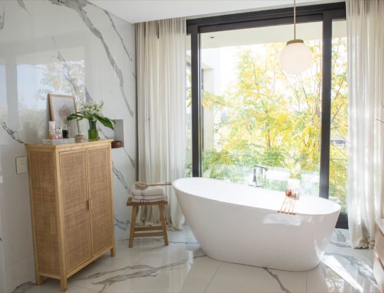 Es clave que en estos casos el baño sea más o menos grande y cuente con buena iluminación -tanto natural gracias a amplios ventanales, como artificial-, de lo contrario podría convertirse en un espacio agobiante.
