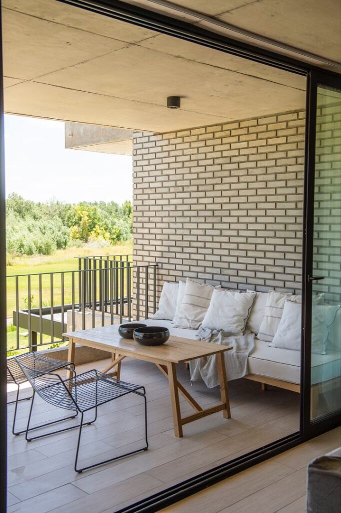 En el balcón terraza, un sillón XL (@teodorashome) se enfrenta a una mesa baja en madera de zoita, con un set de cuencos (@salazarcasa). Poltronas de hierro (Estudio Berna).