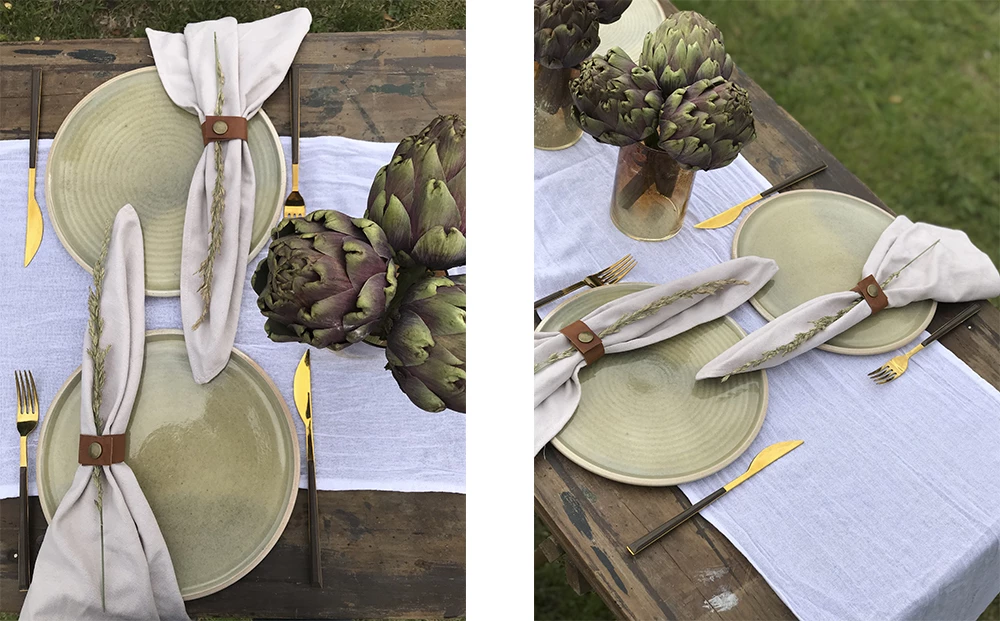 Vamos a usar un camino de gasa pañalera con vajilla de gres en tonos verdosos, servilletas de tela con agarraderas de cuero y florero con alcauciles.