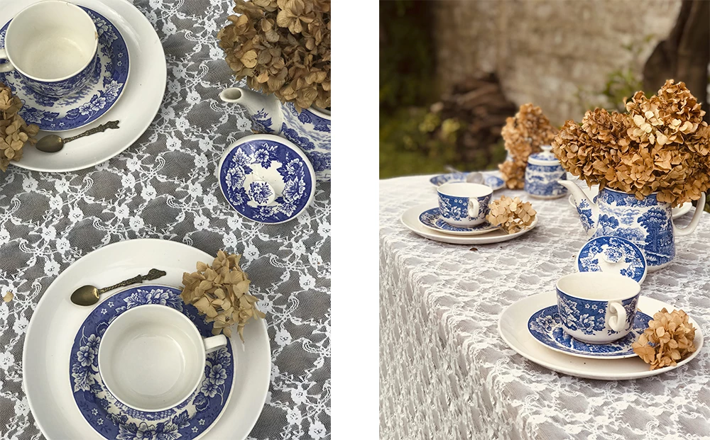 Si no nos podemos encontrar con nuestras familias para almorzar o cenar, esta es una excelente opción. También para seguir en la misma línea en la sobremesa. Vamos a usar vajilla antigua con diseño de la cena inglesa, mantel de encaje, como florero se utilizó la tetera con hortensias secas.