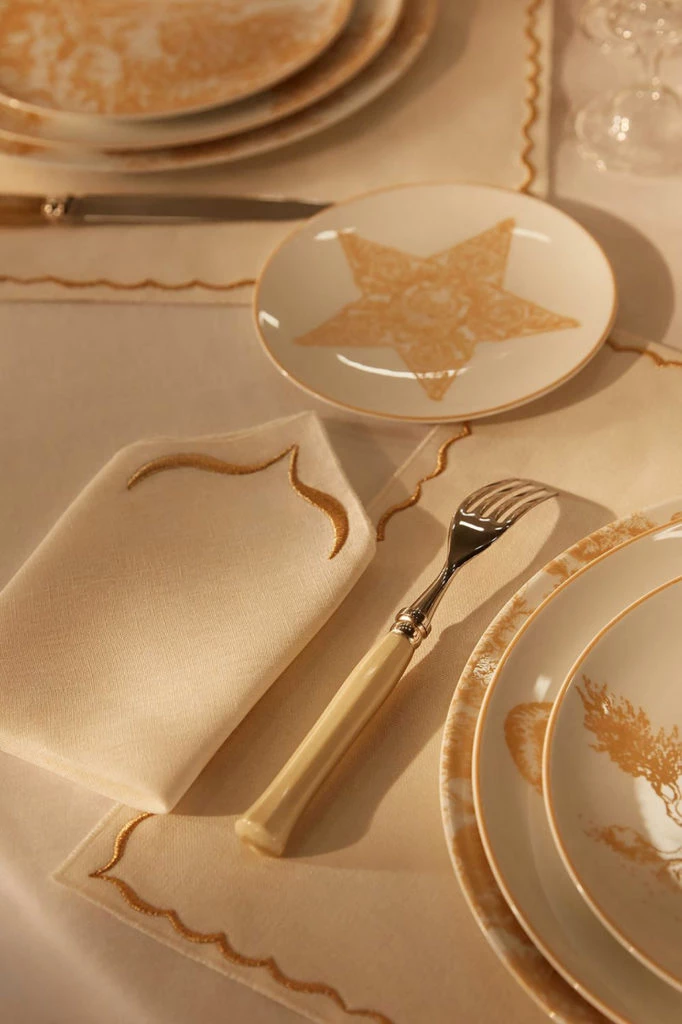 Las delicadas piezas son perfectas para armar una espectacular mesa de Fiestas y se complementan con copas y vasos de cristal pintados a mano con toques dorados, así como también con servilletas e individuales que van a tono.