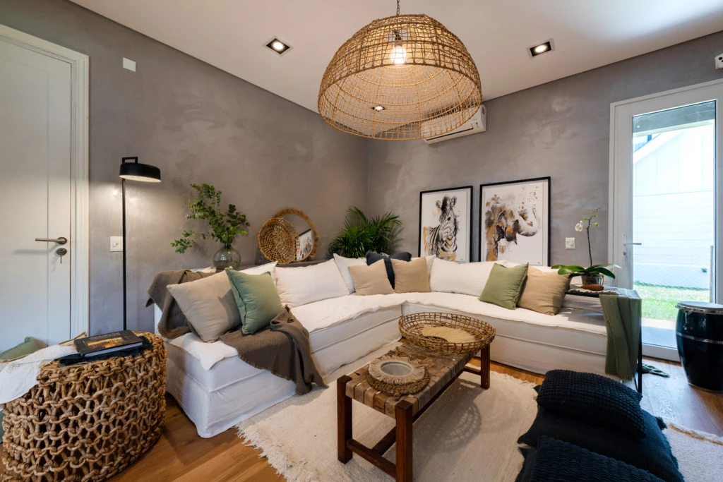 El espacio se pensó en un lugar continuo a la cocina donde el día transcurre compartiendo exquisitas comidas, risas, charlas y juegos. El papel preponderante del sillón en L de lino natural, la calidez, tacto y apariencia texturizada, crea un look sofisticado y relajado, acompañado por almohadones tonos color tierra, una mesa de centro rectangular, amparada por una alfombra artesanal cuadrada de hilo. En la visual opuesta, un mueble con personalidad robusta dada por la madera, realizado con las placas de la línea expresión natural guayubira de Enchapadora San Juan. Los estantes abiertos dejan atisbar la sutileza del color zepelín efecto especial velvet de Alba design Mate de las paredes que envuelven el ambiente, resaltando la presencia del arte y armonizándolo.