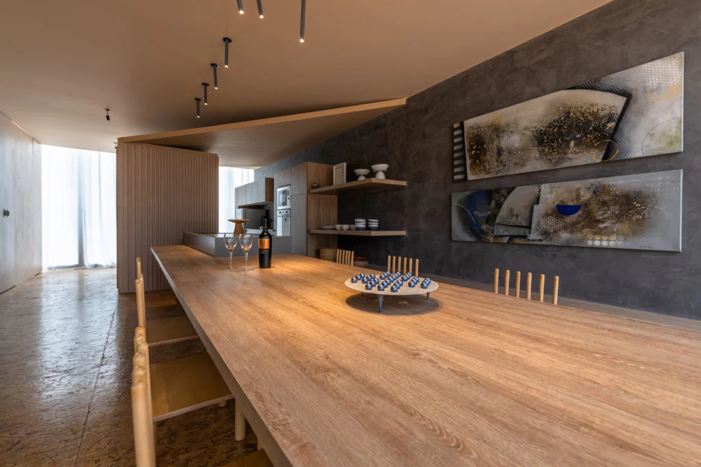 En la cocina visualizamos muebles de guardado y el bajo mesada suspendido con la parte superior libre, la cual se intervino con un revestimiento cuarcita color lumix (Canteras) logrando una dualidad. Entre cocina y recibidor, los herrajes y correderas invisibles con patrones geométricos en su construcción (Blum) generan mayor amplitud resaltando el diseño. La mesada alzada de Silestone color negro tebas (Canteras) copia la silueta que dibuja dicho mueble, continuo al mismo encontramos la mesa, con un sistema mecanizado, permitiéndonos acceder a un bar en momentos de relax, acompañado con sillas de estilo.