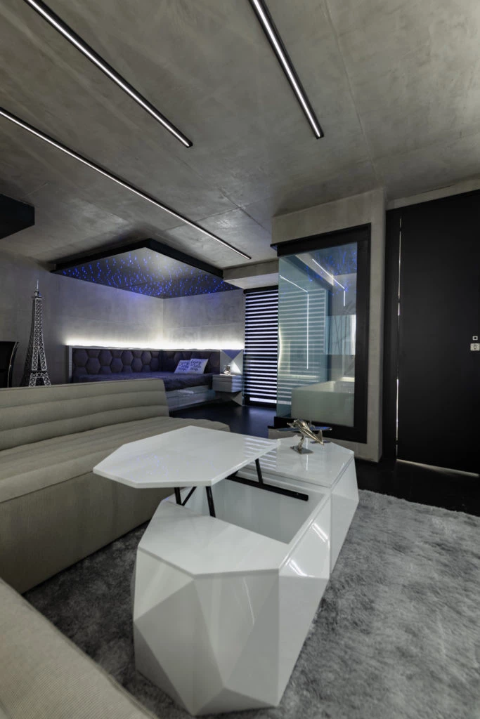 El proyecto fue pensado para un empresario/a que vive solo con el interés de simplificar su vida, amalgamando tecnología -diseño, en el mobiliario, iluminación y audio- y generado escenas para cada momento. Es un espacio de escasas dimensiones en el que no existen barreras estrictamente definidas, ni muros, ni espacios cerrados. Está pensado para vivir, trabajar y disfrutar.