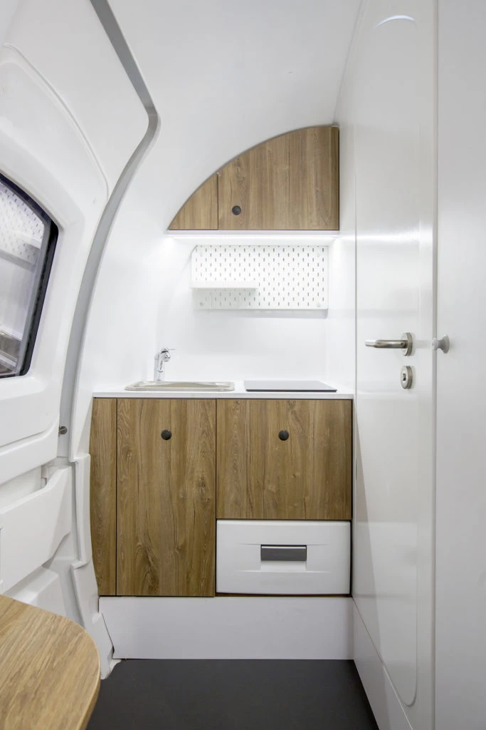 Si bien es una casa rodante que se puede instalar en una playa, en el medio de un bosque o de un campo, también puede funcionar como box de estudio/trabajo en el exterior de una vivienda.