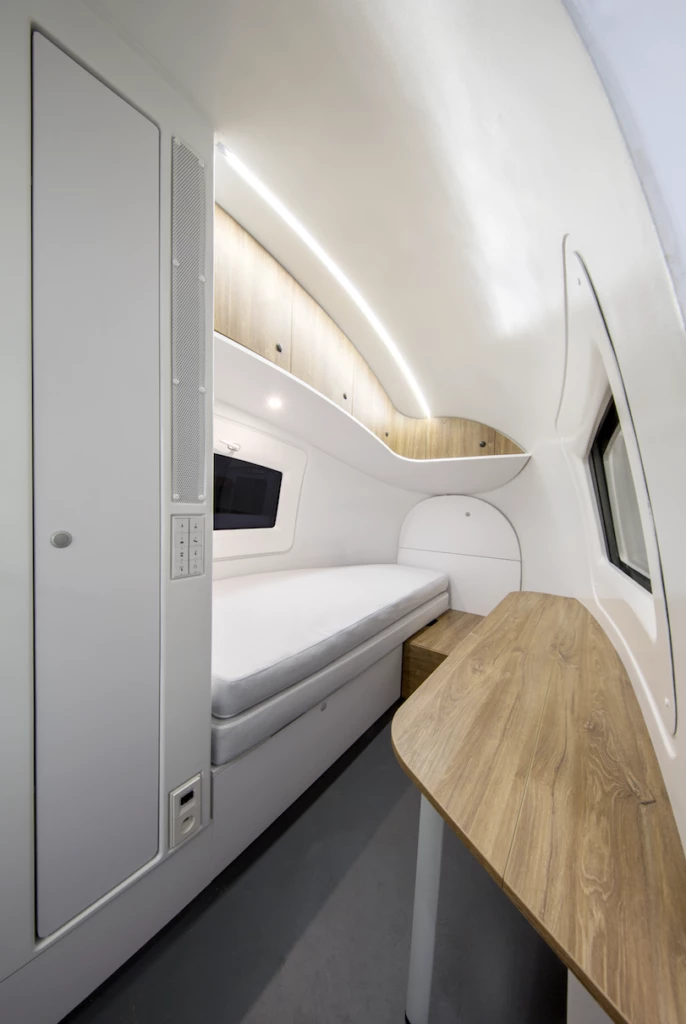 El diseño de la capa exterior tampoco es al azar sino que se pensó para minimiza la pérdida de energía. Las paredes son huecas y están rellenas de aislamiento térmico de alta eficiencia para proteger a los habitantes y contribuir a lograr un rendimiento casi al nivel de una casa pasiva.
