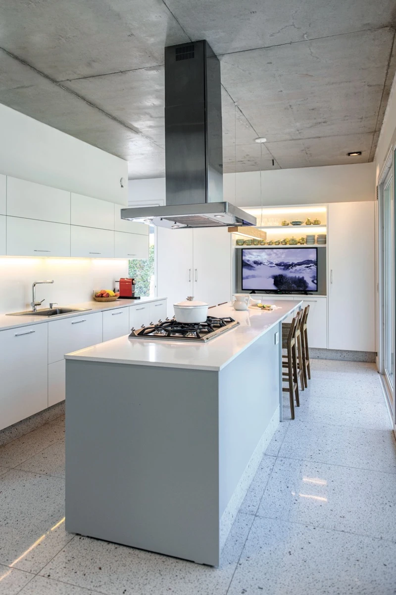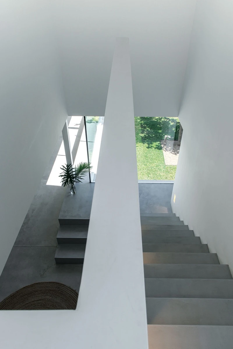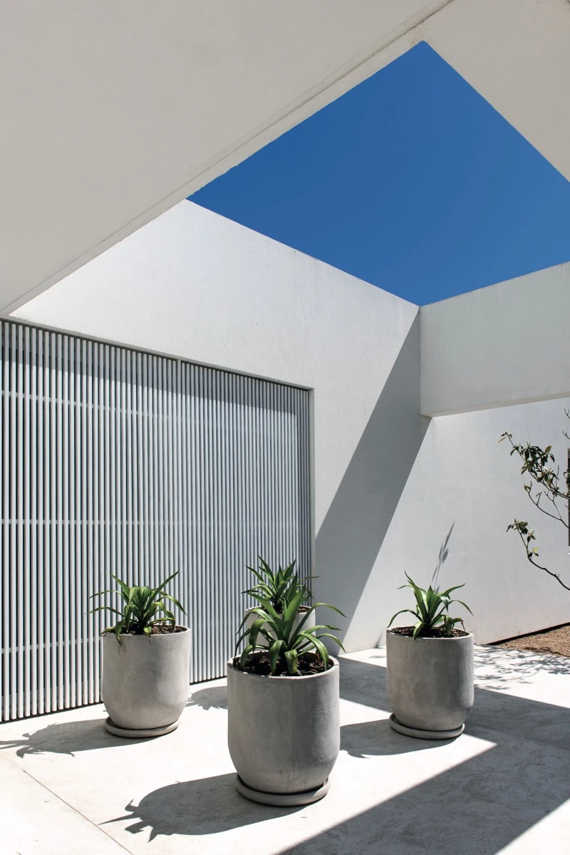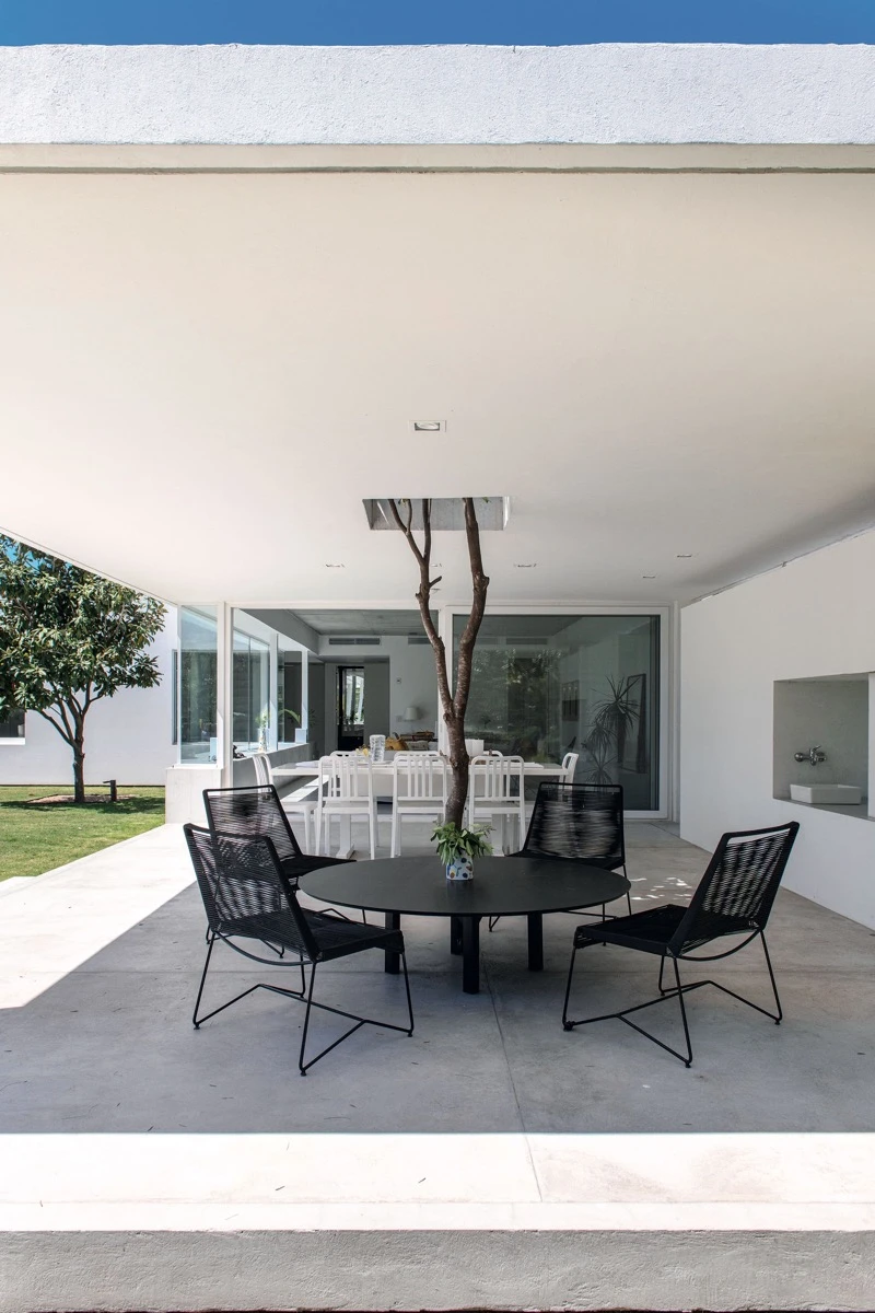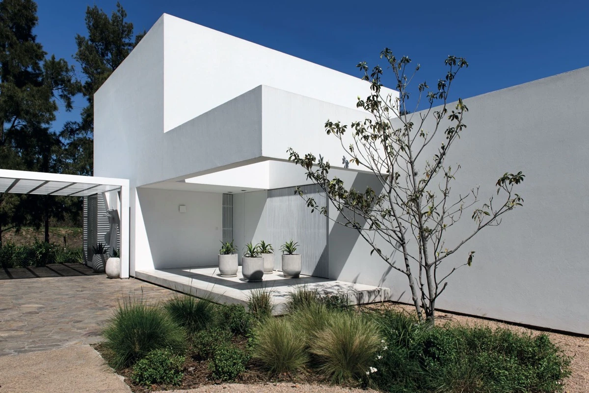 Las características del terreno -irregular, curvo y con una arboleda de gran valor- fue clave para definir la organización espacial de esta casa diseñada en dos volúmenes perpendiculares trabajados con una concepción minimalista, con el blanco como color dominante.