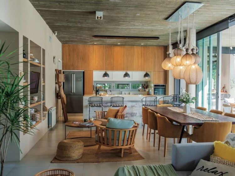 Al fondo se destaca la cocina, que tiene una gran isla de cuarzo ígneastone de 3,20 x largo x 1,40 m de ancho (@itatimarmoleria). Las alacenas altísimas con un detalle interior en blanco están enchapadas en madera de incienso (@elcaminostudio). Banquetas (@bullbuenosaires) y lámparas colgantes (@brocamuebles).