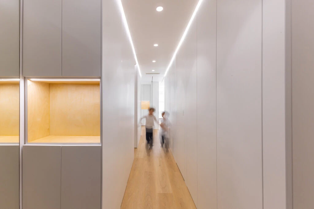 Mediante el uso de tabiques/puertas/mobiliario móviles se dota de versatilidad a los distintos ambientes, pensados para la vida cotidiana.