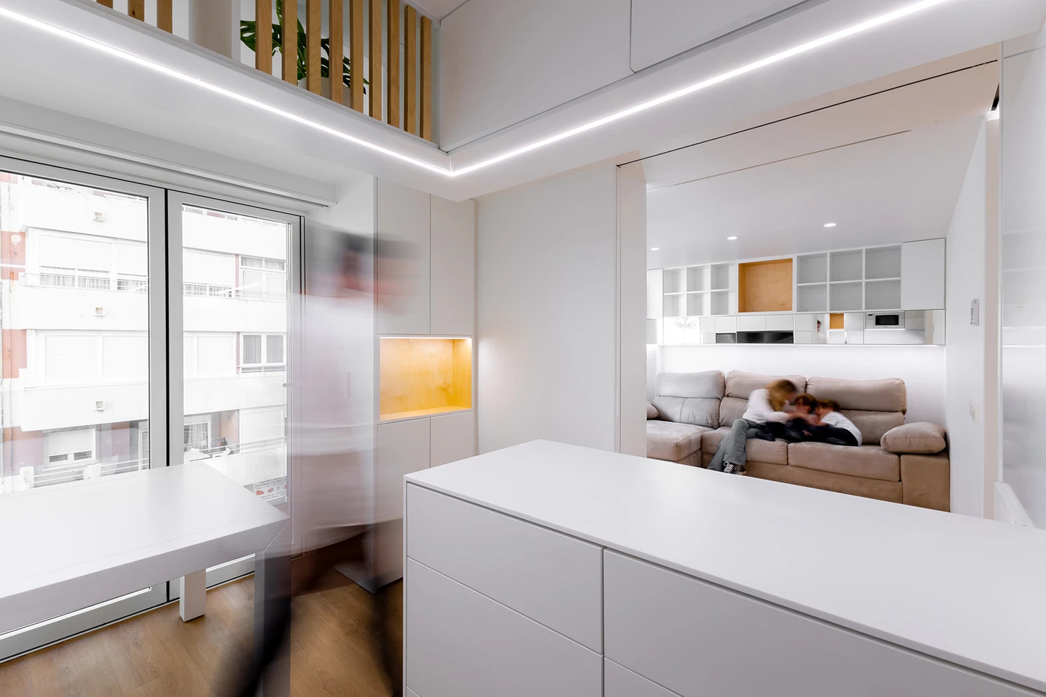 Mediante el uso de tabiques/puertas/mobiliario móviles se dota de versatilidad a los distintos ambientes, pensados para la vida cotidiana.