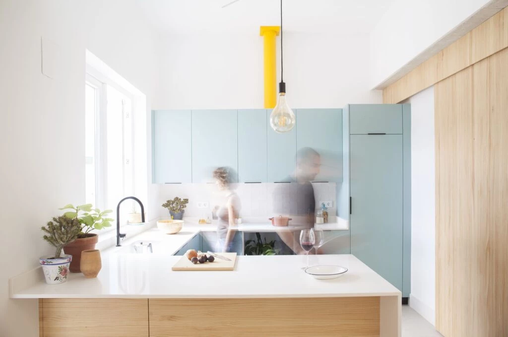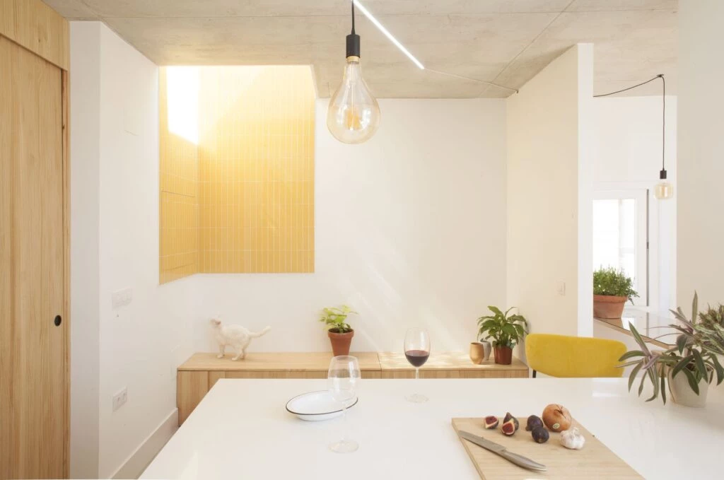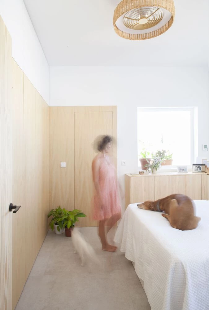 Por último, la distribución de la casa se planificó teniendo en cuenta los desplazamientos de la aspiradora robot, un aparato tecnológico que habita también la vivienda y desempeña un papel crucial al mantener constantemente limpio el pelo y el polvo.