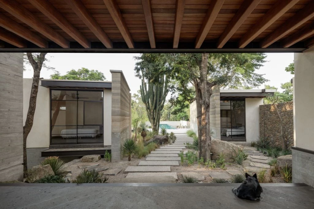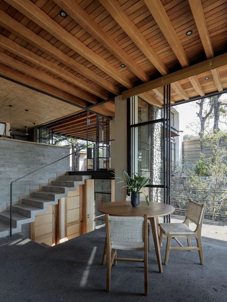 De esta forma, el proyecto deja entrever la habitual casa mexicana; beneficiándose de patios, de sorpresas, y de pausas que se unifican a referencias de una evidente arquitectura japonesa; integrando vigas que se desplazan con un ritmo impecable a través de los diferentes volúmenes de la casa y que contribuyen a la intención de generar espacios abiertos con perspectivas que nacen desde el interior de la construcción.