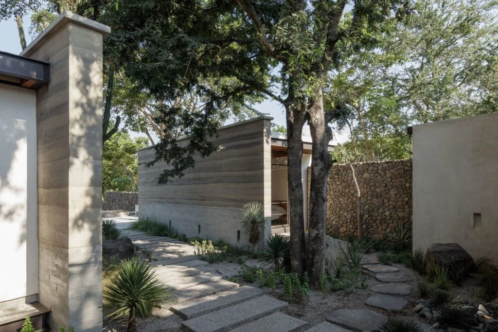 Muros de tapial, que utilizan la antigua técnica de tierra compactada, son acentos que dotan de carácter espacios específicos del proyecto.