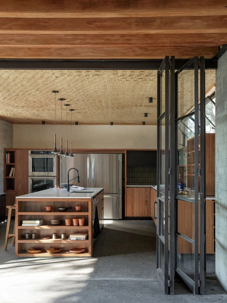 Optar por palma y piedra del río, plafones de carrizo, e implementar herrería en los elementos necesarios son un acto de conexión que trasciende al terreno y a la mano de obra artesanal impulsada por Rangel; acoplándose a nuevas técnicas y soluciones estructurales innovadoras.