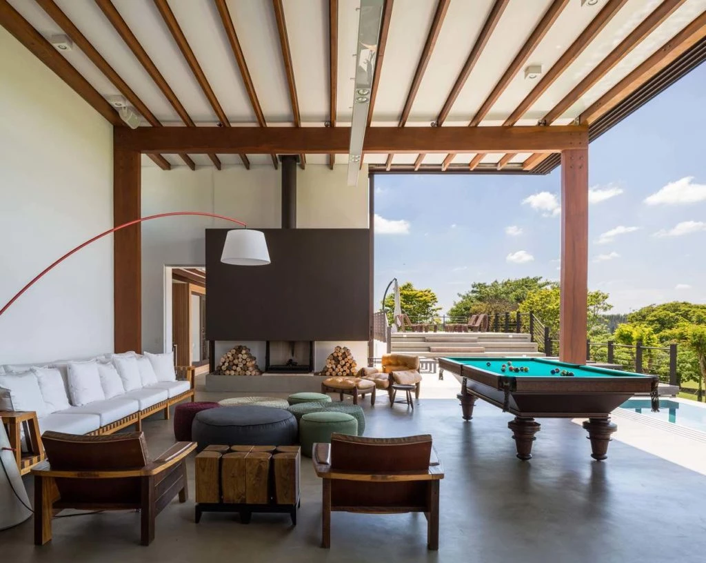 La casa impone un diseño interior contemporáneo y elegante con muros blancos contrastantes con los paneles de madera Cumaru y estructura amarillenta. El acabado del piso es de hormigón gris y la chimenea y escalera son de acero oscuro.