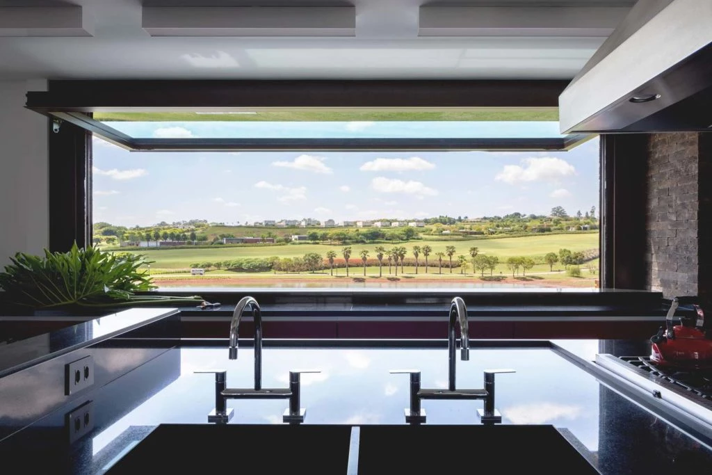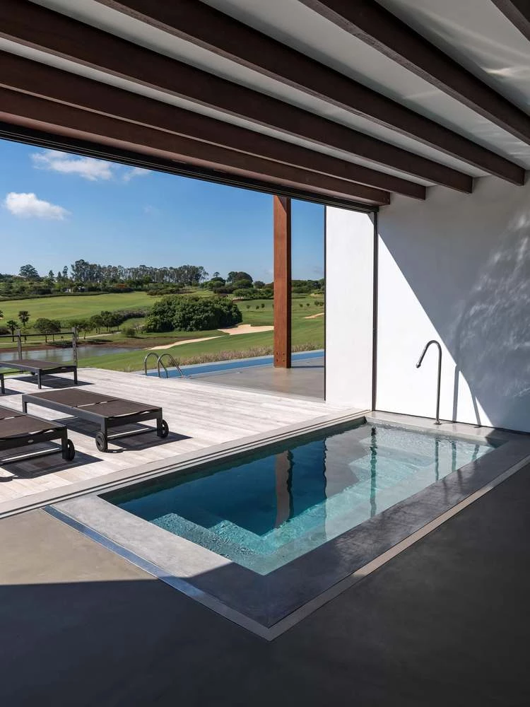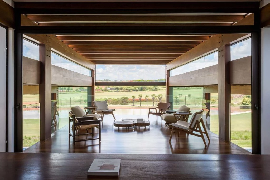 La arquitectura supera los conceptos tradicionales gracias a la interacción entre el interior y exterior y a la piscina ubicada contra la pared de vidrio que forma la fachada y transforma el salón en una gran terraza con vistas al campo de golf.