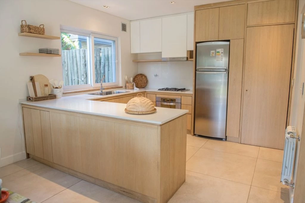 La cocina se dispuso en forma de U, con un mueble bajo mesada en kiri lustrado y mesada de Stone Quartz blanco norte. Dos estantes en kiri y alacenas de melanina blanca completan los espacios de guardado.