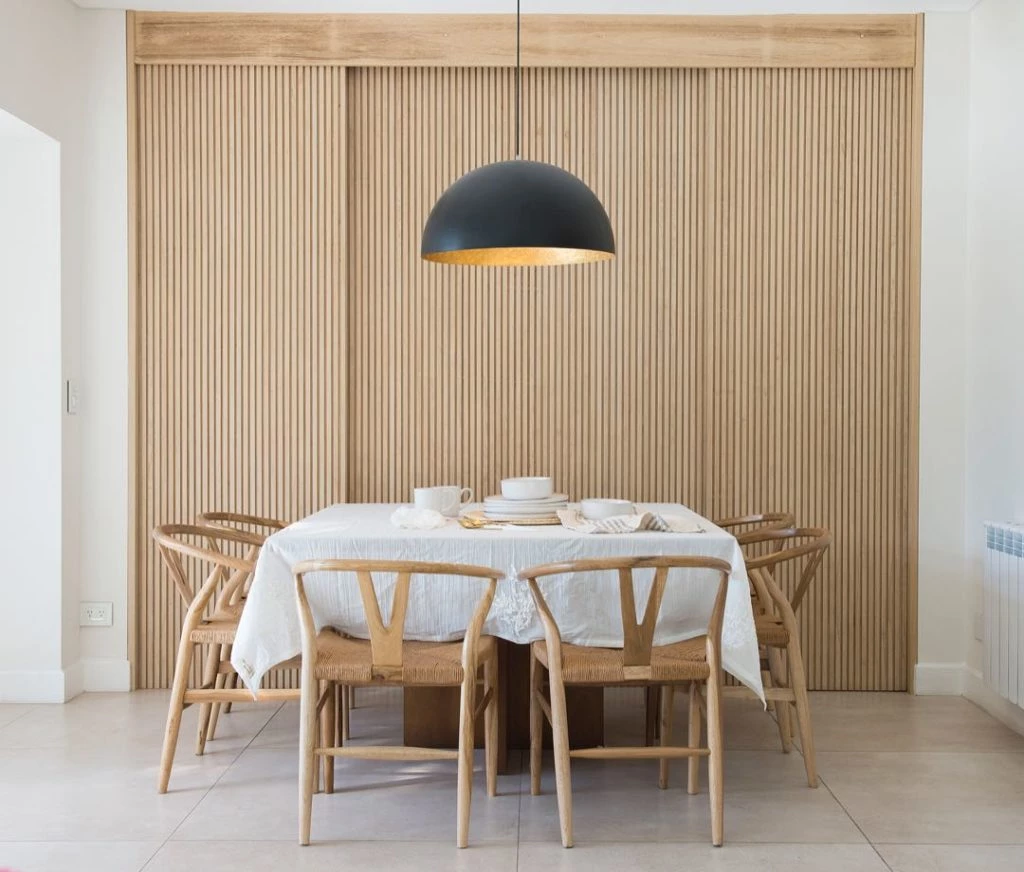 La misma estética y paleta de colores se replica en el comedor, donde se optó por un revestimiento envarillado de madera de kiri para la puerta corrediza que lo separa de la cocina.