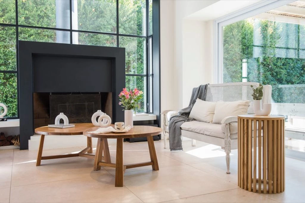 El planteo del estudio Atelier Doucet tuvo como horizonte lograr ambientes luminosos y serenos, algo que se logró con buenas entradas de luz natural, como la que propone en el living el amplio ventanal de hierro y vidrio repartido que envuelve a la chimenea (revestida en hierro) y deja ver el fondo verde que imprime un cerco de Eugenias.