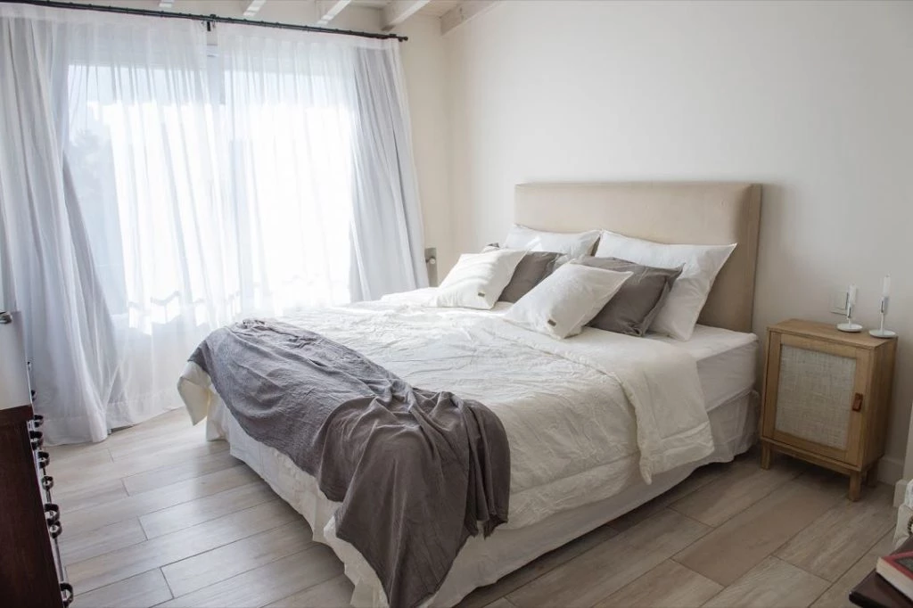 En el dormitorio principal se destaca el techo machimbrado blanco y el amplio ventanal con vista al jardín. La cama se vistió con textiles y almohadones engamados en blanco y gris (@aukenia.home), mientras que la mesa de luz imprime el toque cálido de la exquisita combinación de álamo con yute natural (@food.and.stories).
