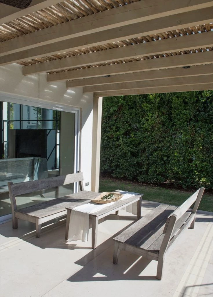 En exteriores, sorprende la galería resuelta con una pérgola que propone columnas de anchico, cabios en pino Paraná, troncos y chapa transparente. El piso es de cemento alisado con guarda de calcáreo, impecable.