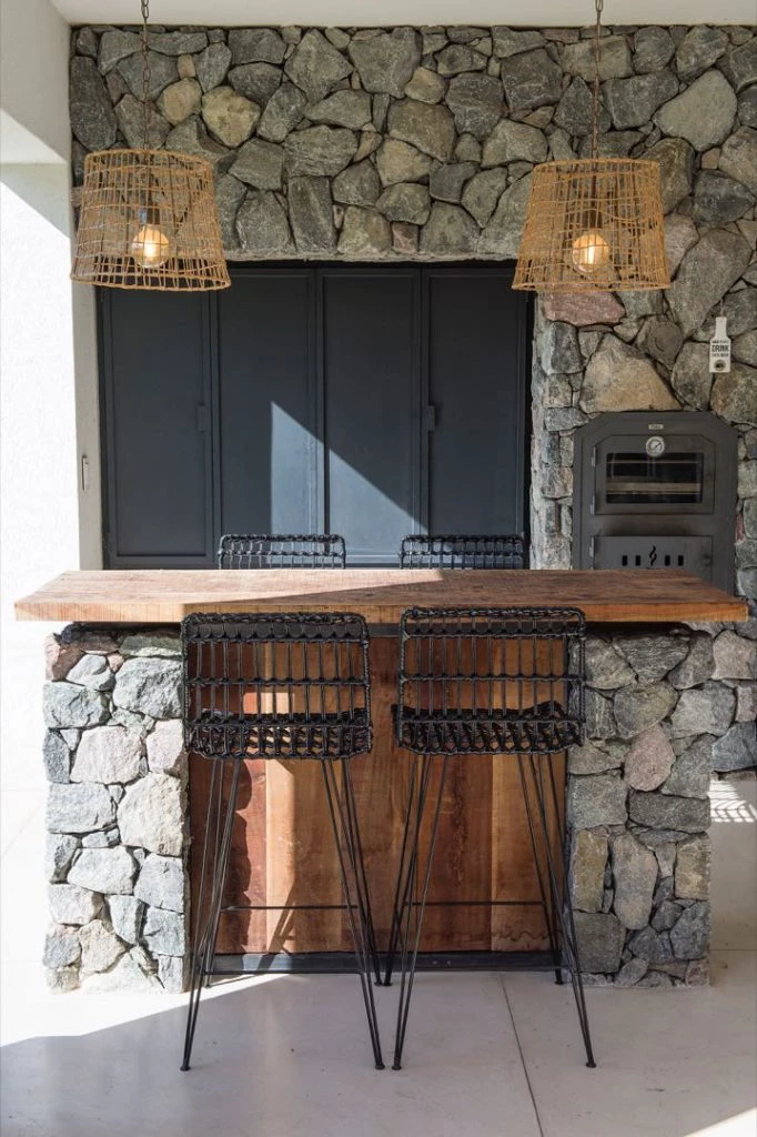 El sector parrilla aparece enmarcado por la pared íntegramente revestida en piedra voladura de Tandil, material que se repite en el frente de la barra, que lleva tapa armada con durmientes de quebracho, al igual que las dos puertas del espacio de guardado en el bajomesada.