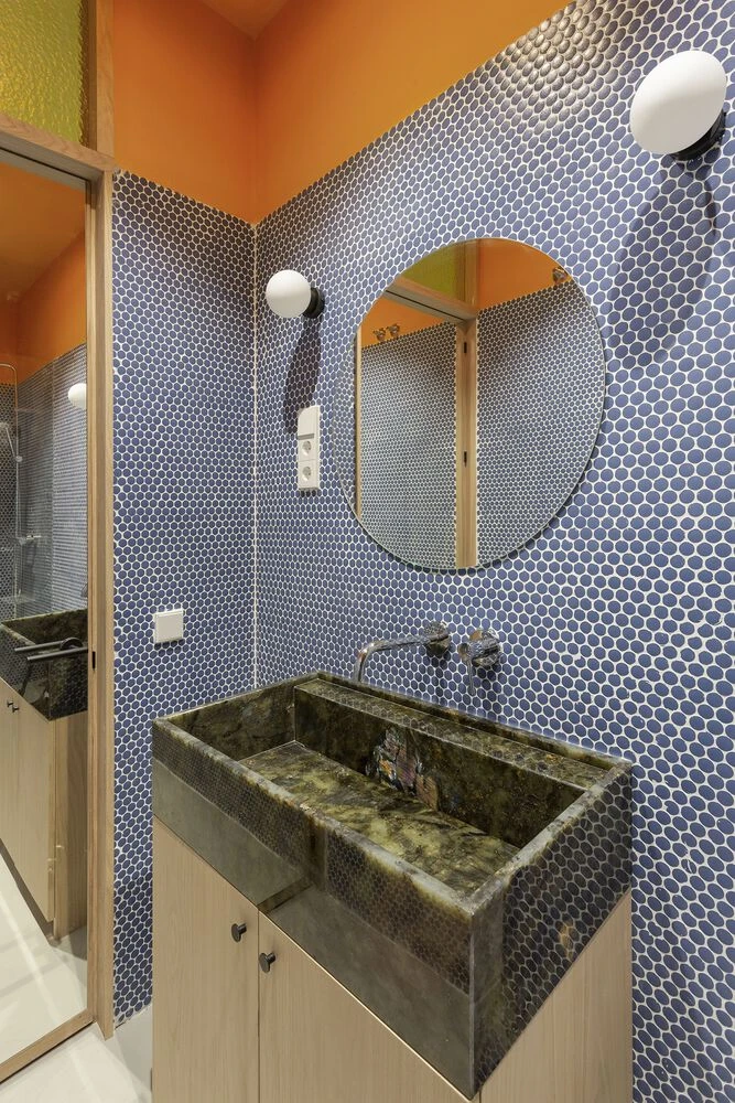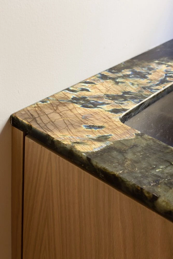 Pero sin dudas, el detalle más impactante es la mesada de cuarcita verde: un verdadero espectáculo visual, con toques iridiscentes que cambian según la luz del día.