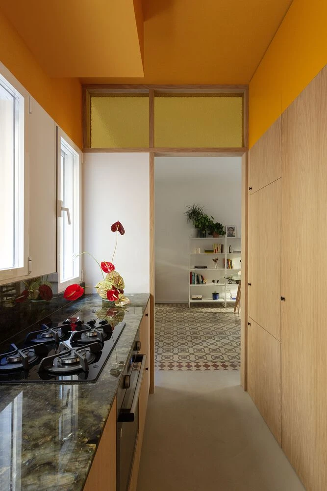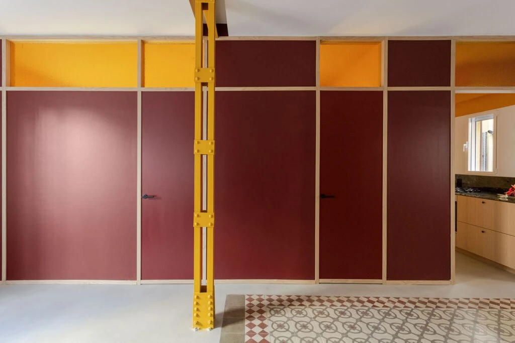 ¿El broche de oro? El dormitorio, donde las baldosas hidráulicas originales conviven con un techo amarillo vibrante que se funde con el vidrio del tabique, generando una conexión visual única con el resto de la casa.