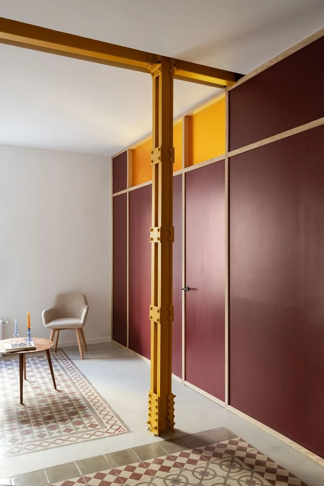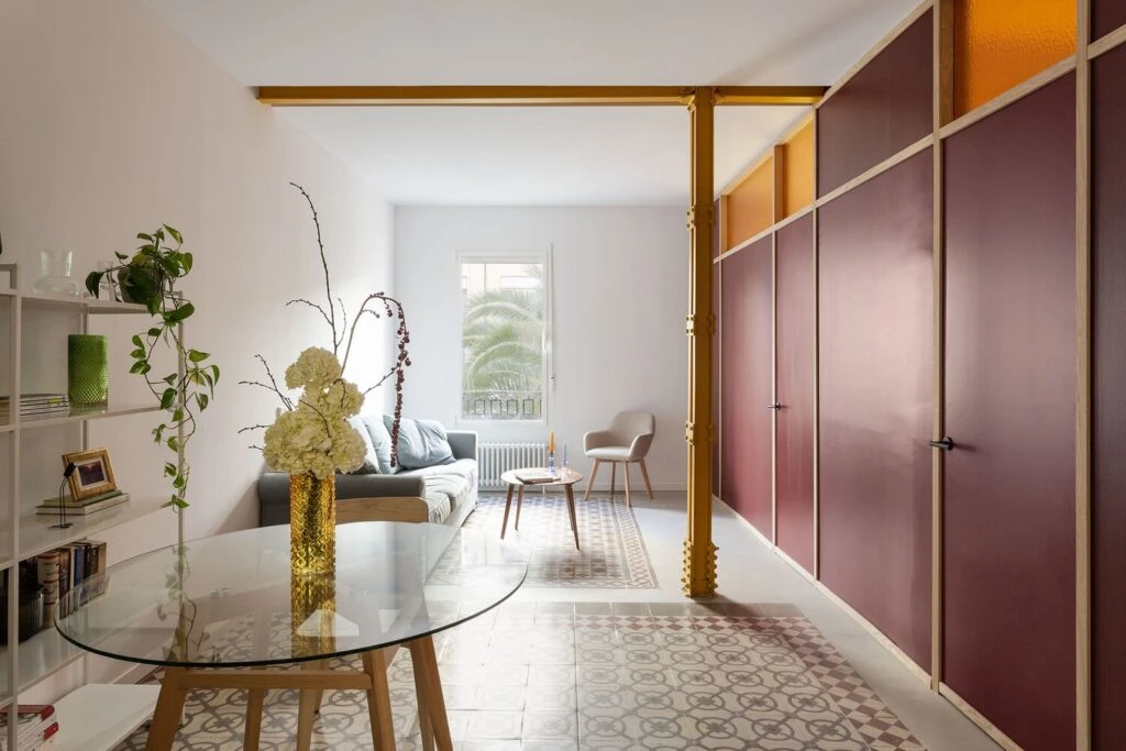 El uso del color también dice presente con fuerza en la reforma. El tabique que separa las zonas comunes del área privada es de un tono granate intenso, una elección arriesgada que le suma dramatismo y calidez.