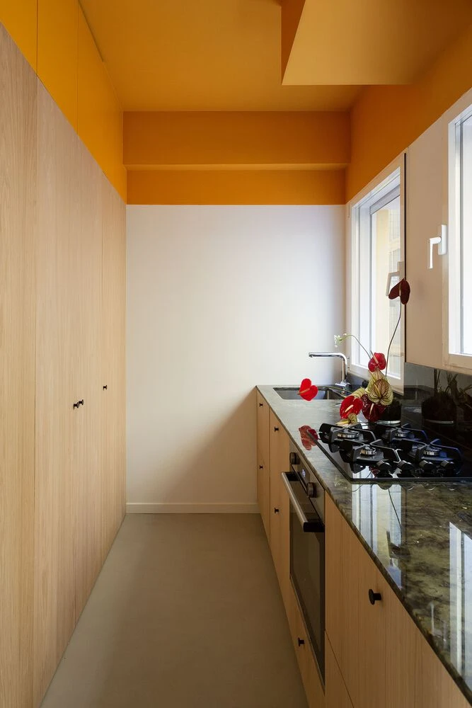 La cocina, pequeña y sin ventanas, se convirtió en una de las estrellas del proyecto gracias a un rediseño que apostó por materiales nobles, colores audaces y una distribución abierta e inteligente.