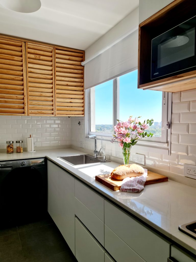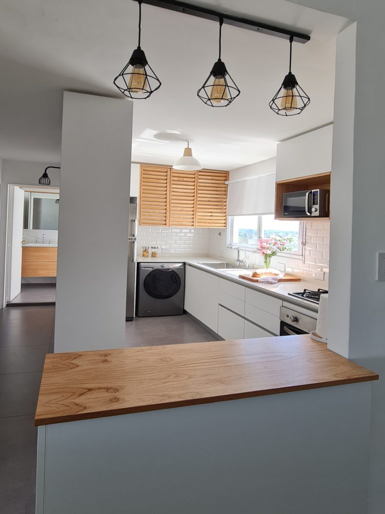 Para lograr este resultado, la arquitecta tiró abajo las paredes que dividían la cocina del living y diseñó una barra súper canchera hacia el pasillo y un mueble alto de guardado para optimizar el orden y la organización. Para más luminosidad y modernidad, se eligió una paleta blanco + madera paraíso. Esta combinación se replica en todos los espacios del depto.