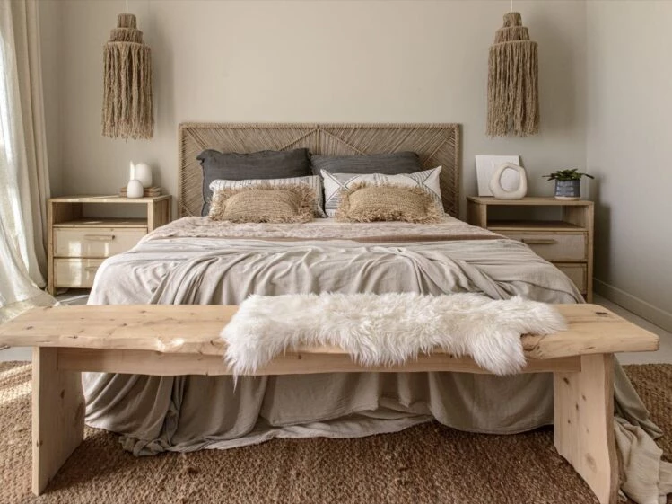 Los accesorios de fibras naturales tienen el poder de aportar un toque fresco y cálido al mismo tiempo. Y en el dormitorio se imponen través de muebles, lámparas, alfombras, pufs, espejos, cestos e incluso macetas.