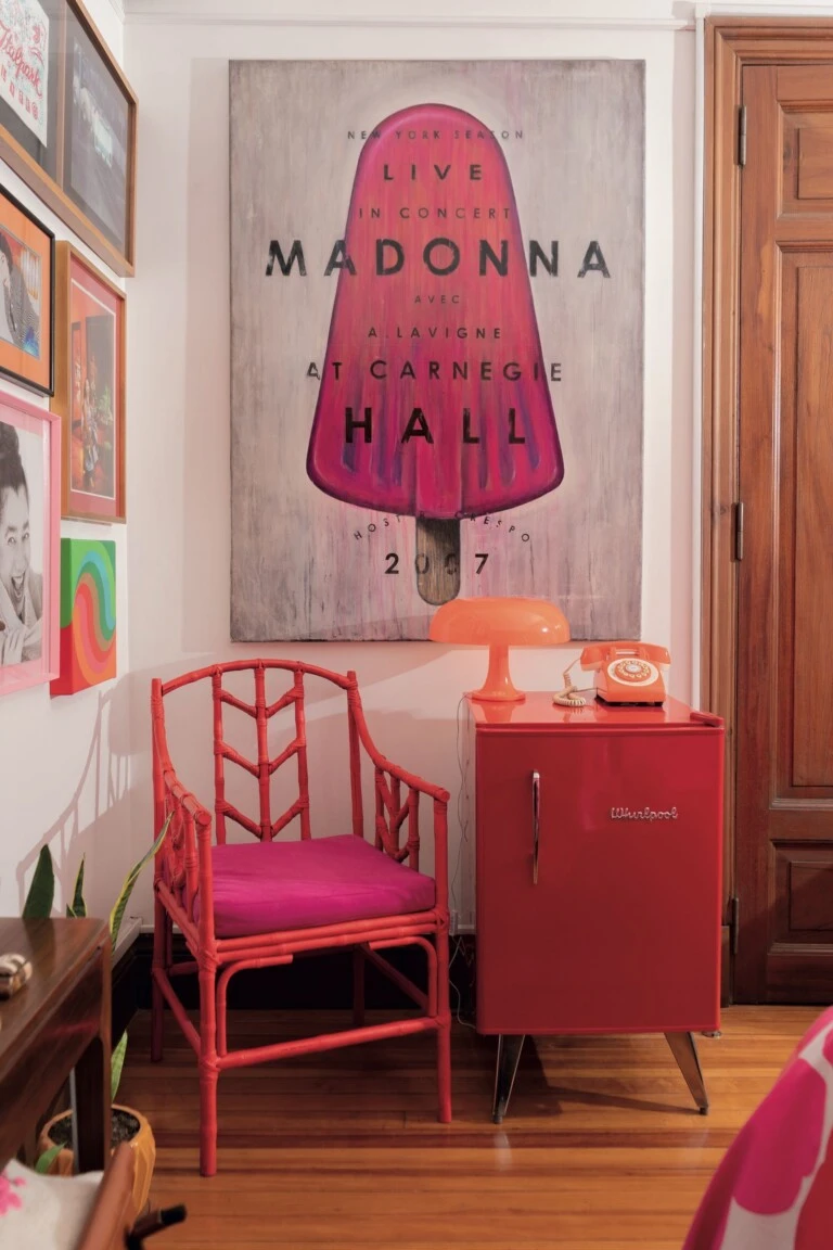 El dormitorio “in red” y escenográfico de Mariela Ivanier incluye mega vestidor y rincón arty con mobiliario vintage.