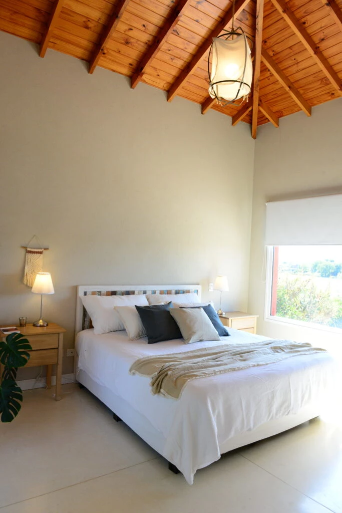 El espacioso cuarto principal de esta casa que evoca el tradicional mexican style enamora con su techo a cuatro aguas de madera del que cuelga una lámpara de hierro y tela (@nap.ba). La cama lleva un respaldo con maderas de demolición en su estado original (Almacén de interiores). Textiles y almohadones (@sophiev.deco).