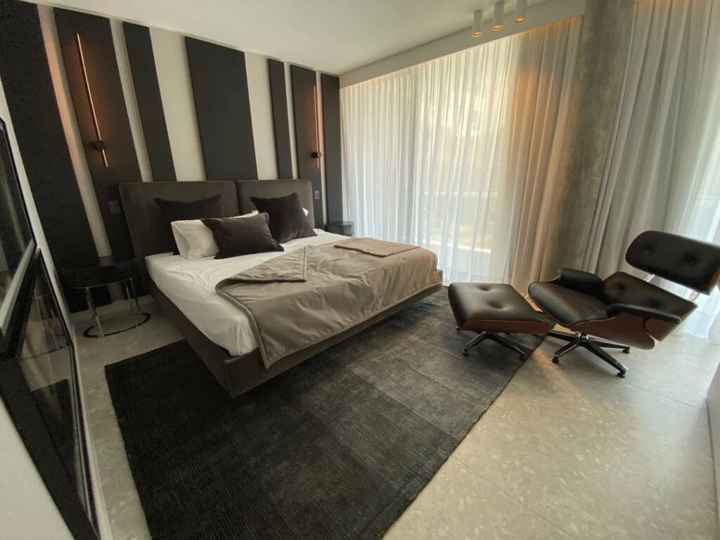 El negro presente el revestimiento de la cabecera, compuesto por placas rectangulares equidistantes en madera, brinda intensidad y crea un espacio moderno, mientras que el beige, los marrones y los blancos de los textiles, otorgan confort y sensación de calma. Apliques sobre el respaldo (Loop Iluminación). Un sillón Eames con su apoya pies en madera y cuero, suma diseño de autor. Las cortinas son de gasa de lino automatizadas.