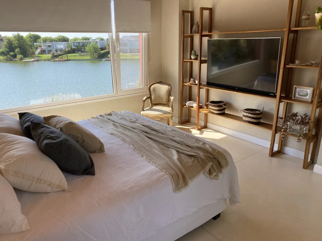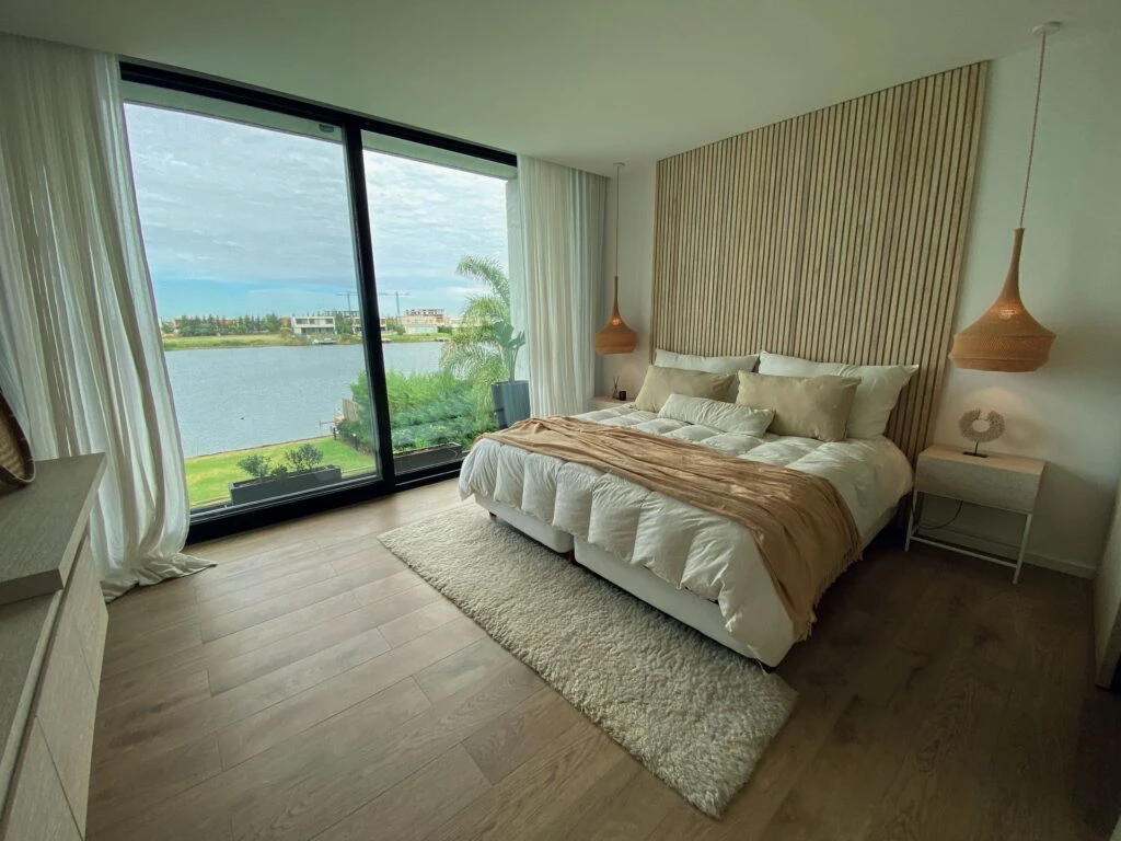 El dormitorio matrimonial de esta modernísima casa con vista al lago se ubicó estratégicamente de cara a la laguna y le da rienda a los colores claros, blancos y puros, combinados con la calidez de los pisos de madera.