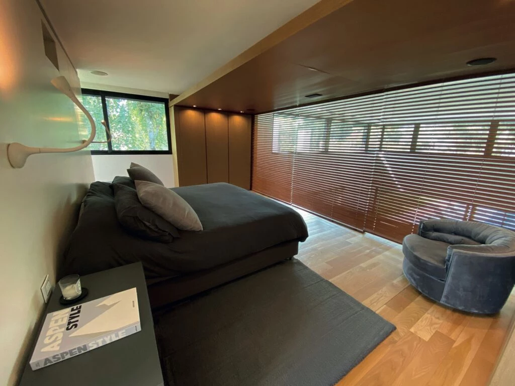 En el dormitorio principal de esta casa diseñada a la medida de un amante de la música la madera envuelve a la caja suspendida que balconea hacia el área social (Carpinteria Pampa). El sommier mira de frente hacia el gran paño de vidrio fijo que gana privacidad con cortinas roller de bandas horizontales (Hunter Douglas). Un sillón de respaldo envolvente propone un rincón de lectura en esquina. Los pisos son de madera flotante.