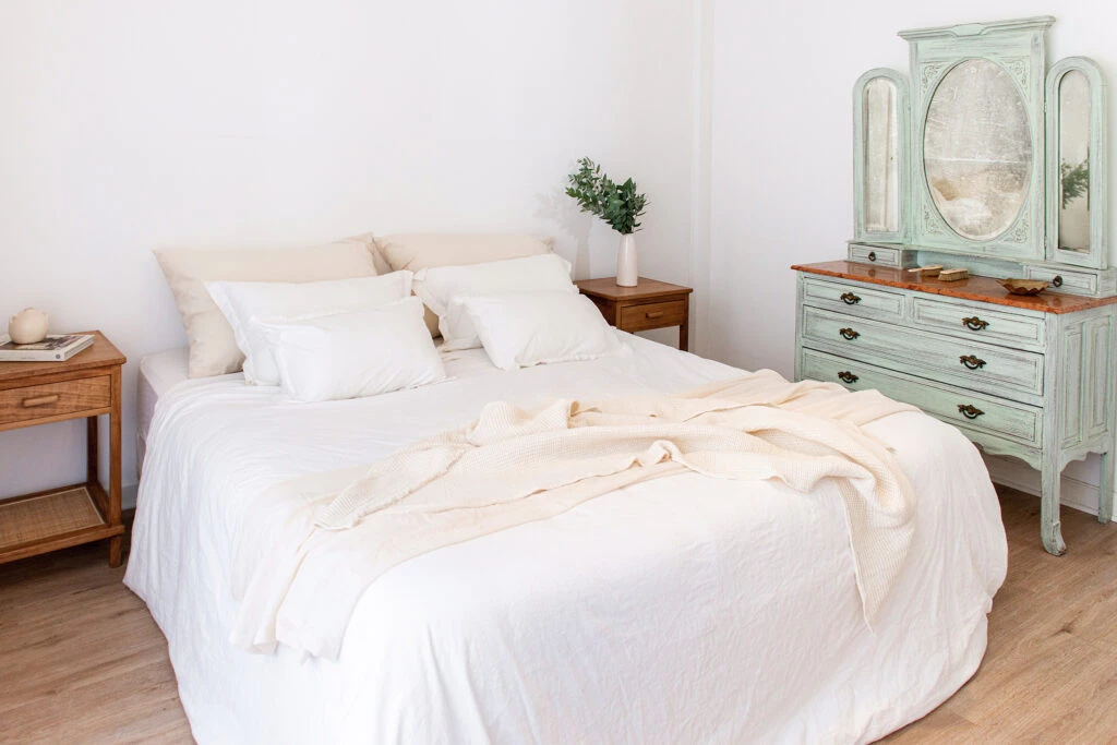 El dormitorio de este depto cálido y relajado con alma campestre prioriza los tonos claros, con ropa de cama, almohadones y manta a los pies (@sophie.v.deco) en blanco y natural. Las mesas de luz son de madera de kiri tonalizado roble claro (@somosyugen).