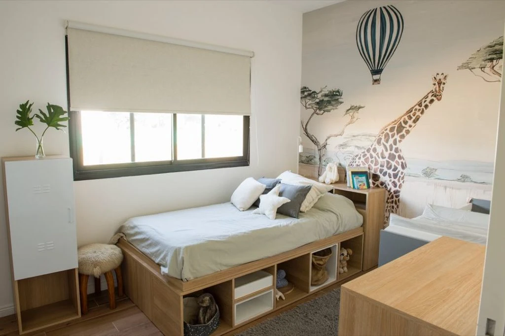 Para los pequeños exploradores, nada mejor que un cuarto con inspiración selvática. Paredes con murales de hojas, camas con forma de casita en madera natural y muchos peluches de animales y alfombras que simulan ser una hoja crean un espacio de aventura y diversión.