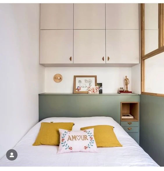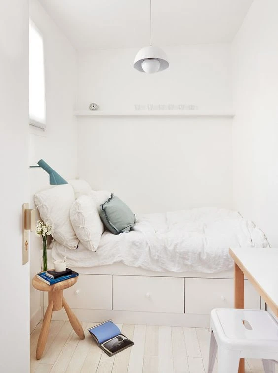 Puede parecer que, cuando hablamos de dormitorios mini, la mejor opción sea una cama también mini. Pero lo que realmente importa es que sea una cama baja con un colchón bajo.