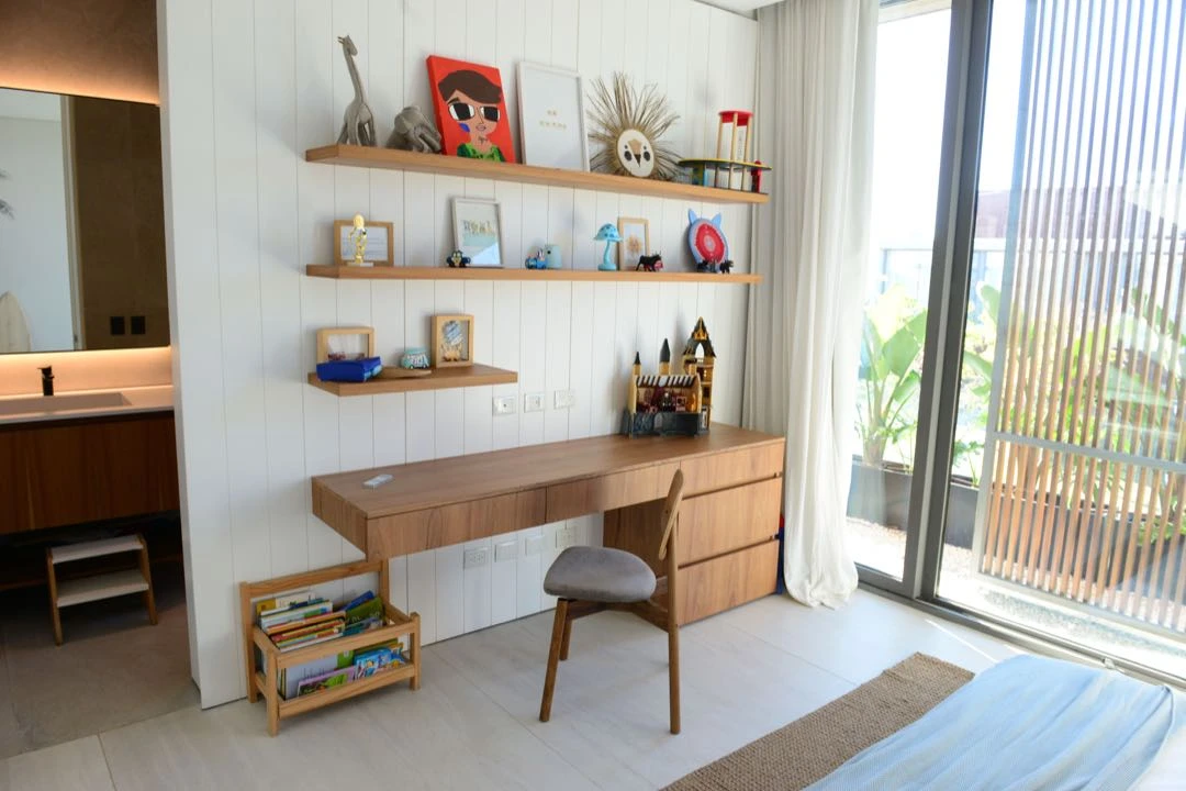 El espacio de estudio propone una consola de madera diseñada a medida y apoyada contra la ventana, con espacio para compartir juegos o estudio de a dos. Como complemento, una biblioteca en alzada.