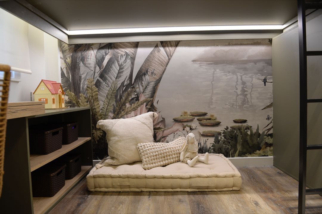 Lo respalda la pared con papel mural con motivos de la naturaleza (Mercedes Costal) en combinación con los tonos de las melaminas (Verde Safari, de Faplac y Roble Halifax Tabaco, de Egger). Ropa de cama, alfombra, colchón sobre el piso con almohadones y textiles (@anotherhomedeco).