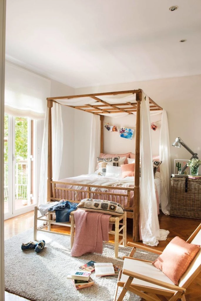 - Con dosel: si bien tienen fama de románticas, todo depende del material que se elija y del estilo de la decoración. Son ideales para habitaciones amplias y con techos altos. Los materiales más elegidos son madera natural, madera contrachapada o maciza y de hierro.